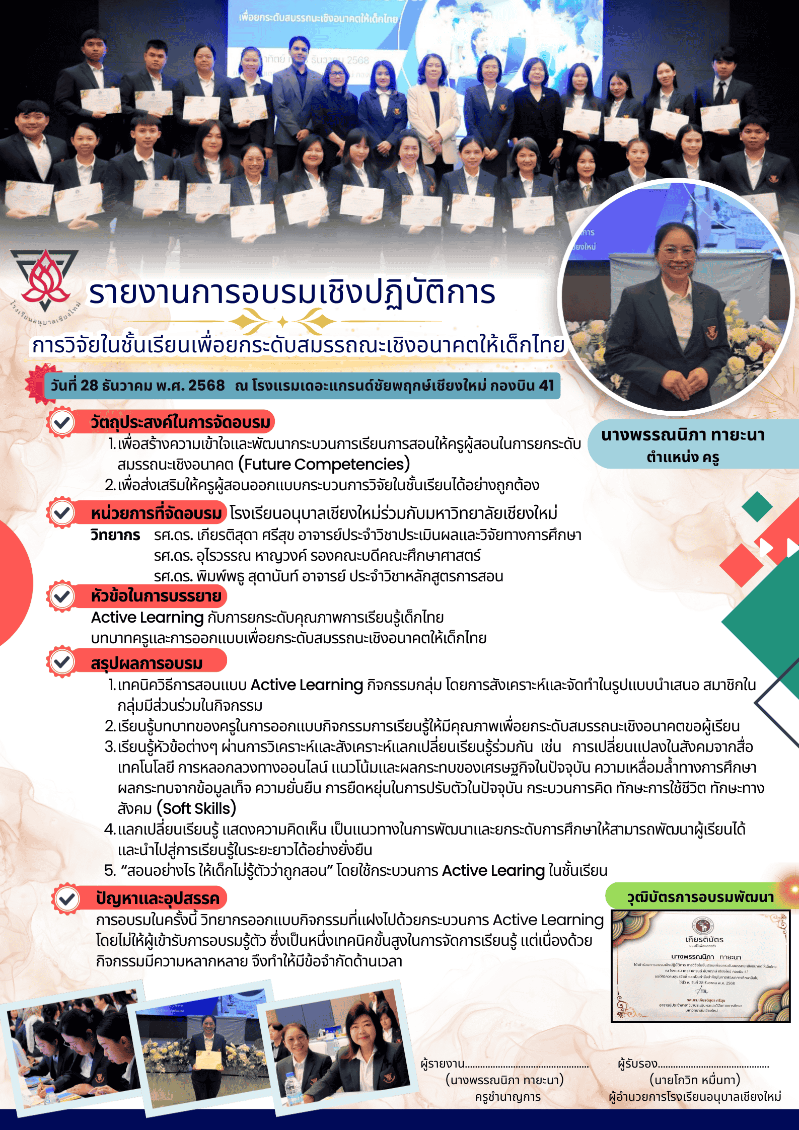 รายงานการอบรมเชิงปฏิบัติการ การวิจัยในชั้นเรียนเพื่อยกระดับสมรรถณะเชิงอนาคตให้เด็กไทย