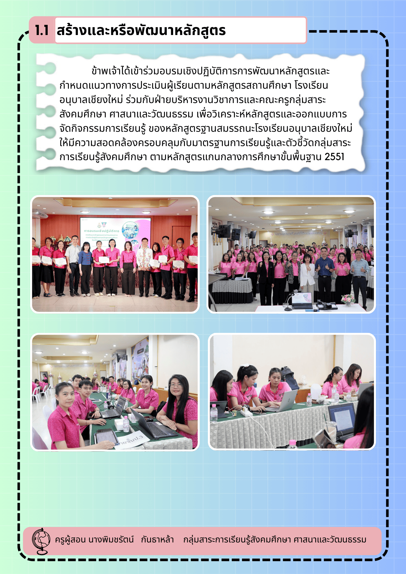 ข้าร่วมอบรมเชิงปฏิบัติการการพัฒนาหลักสูตรและกำหนดแนวทางการประเมินผู้เรียนตามหลักสูตรสถานศึกษา โรงเรียนอนุบาลเชียงใหม่ 1.ด้านการจัดการเรียนรู้ 1.1 สร้างและหรือพัฒนาหลักสูตร วันที่: 08/03/2026 20:48