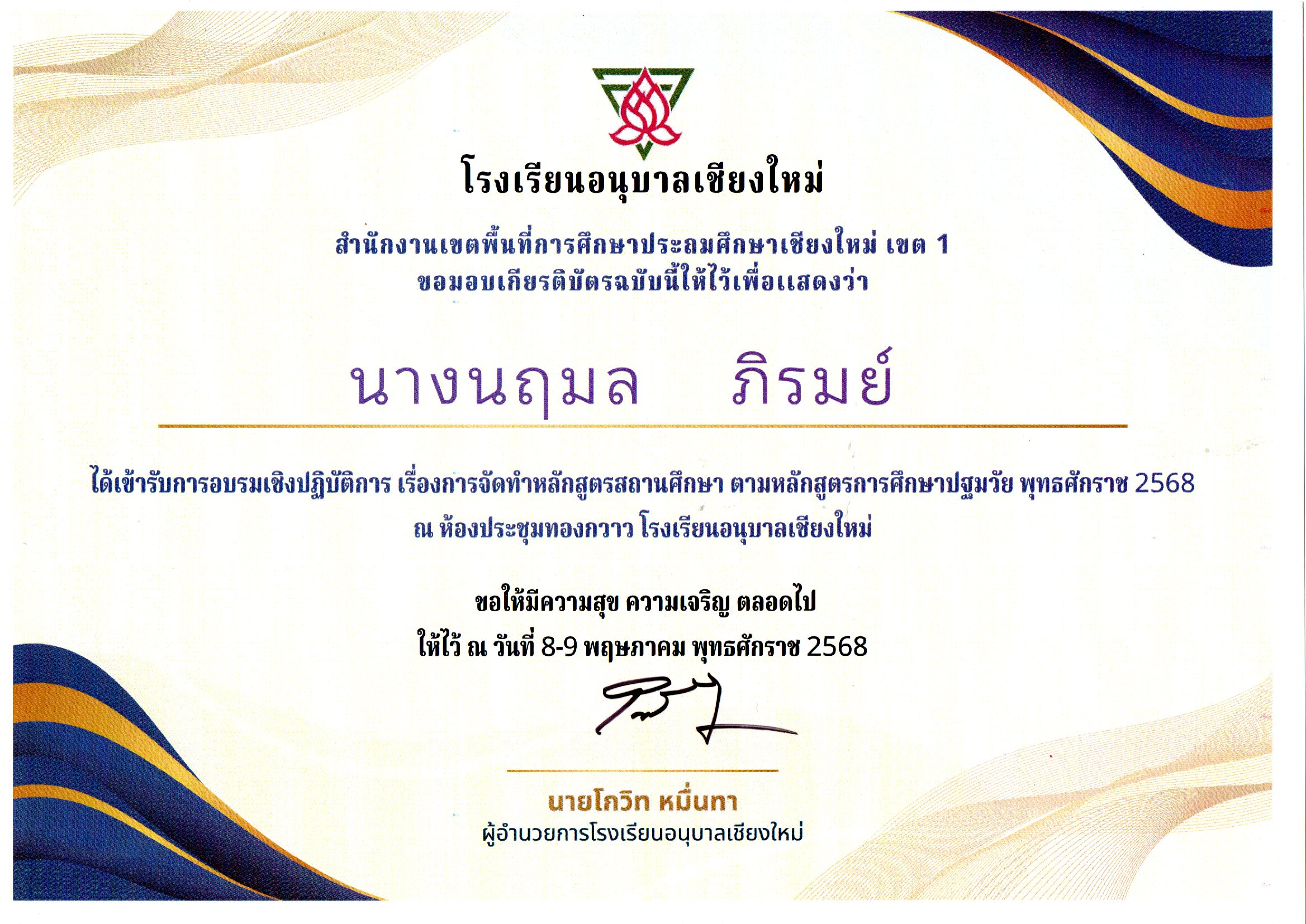 เรื่องการพัฒนาหลักสูตรสถานศึกษาฐานสมรรถนะ โรงเรียนนำร่องพื้นที่นวัตกรรมการศึกษา ระหว่างวันที่ 8 -9 พฤษภาคม 2568 จำนวน 12 ชั่วโมง จัดโดยสำนักงานเขตพื้นที่การศึกษาประถมศึกษาเชียงใหม่ เขต 1