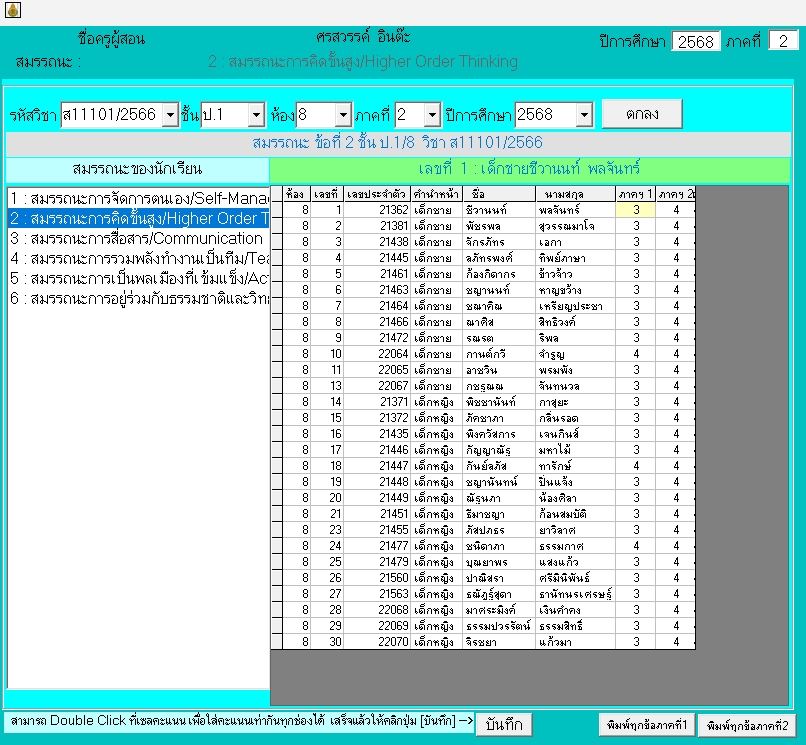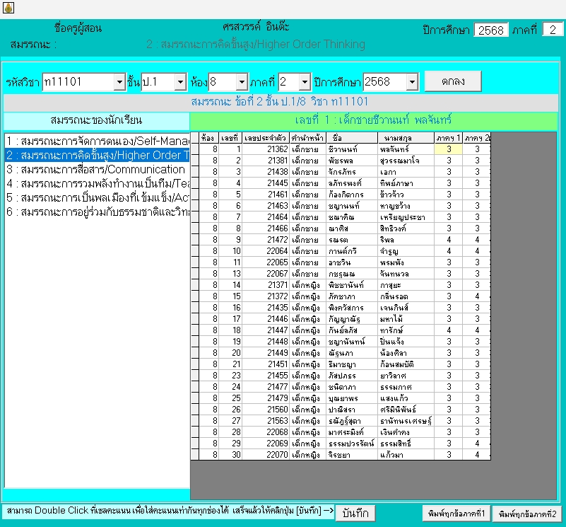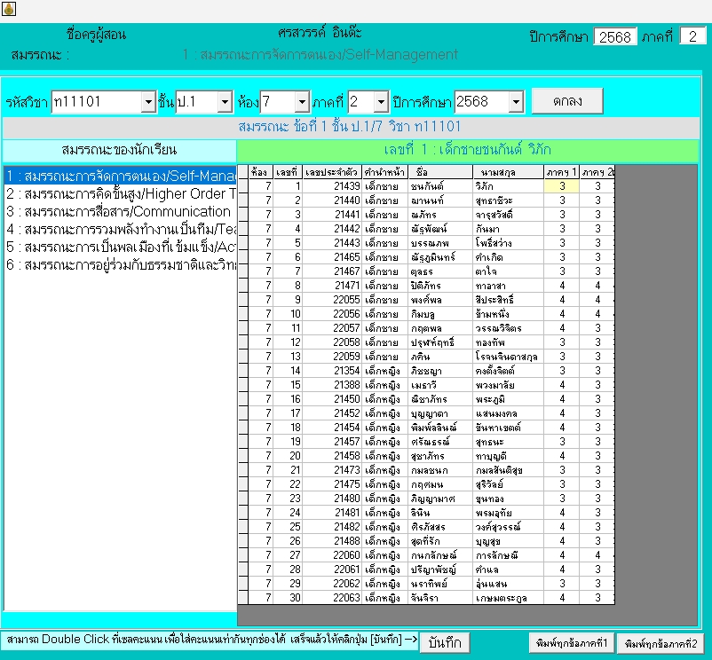 ในปีการศึกษา 2568 ได้วัดผลประเมินผลสมรรถนะรายวิชาภาษาไทย และวิชาสังคมศึกษาของนักเรียนชั้นป.1/7-1/8