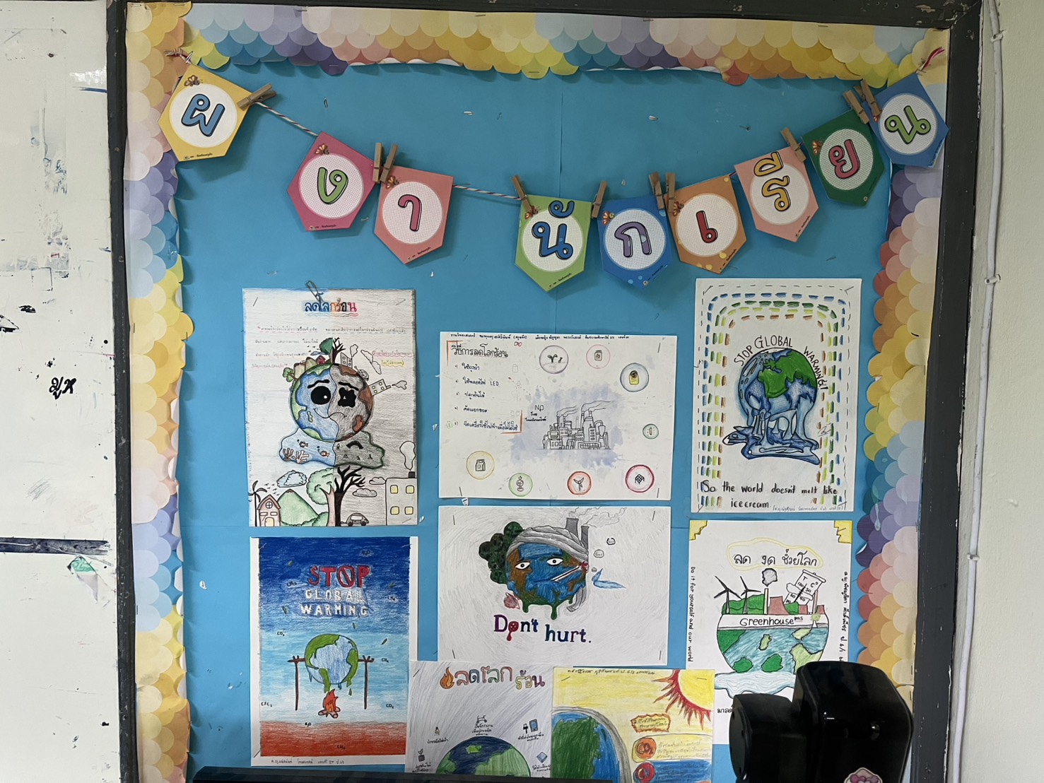 จัดห้องเรียนให้มีความสะอาด เหมาะสม เหมาะแก่การเรียนรู้ มีมุมหนังสือของห้องเรียน บอร์ดความรู้ ผลงานนักรเรียน เครืองฟอกอากาศ