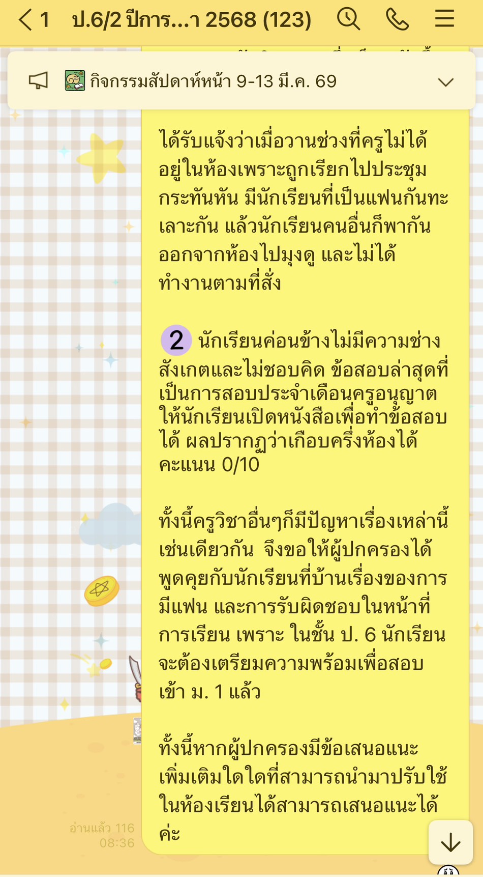 มีการสื่อสารร่วมกันักเรียนและผู้ปกครองเพื่อสร้างการพัฒนาทั้งด้านคุณธรรม จริยธรรม และด้านวิชาการร่วมกัน ผ่านไลน์กลุ่มห้องและการโฮมรูมก่อนเข้าเรียน